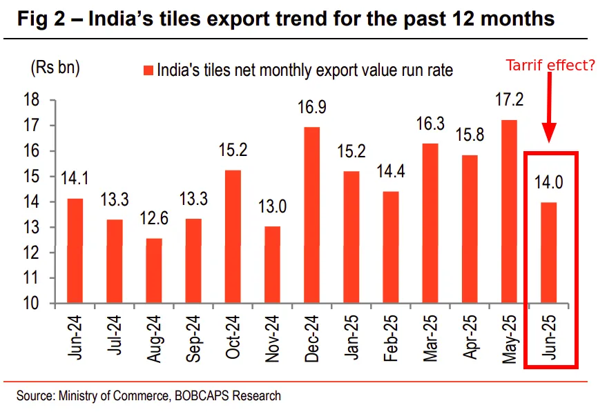 Tiles story not all that different. First half of Q1 had momentum, domestic demand steady, exports seemed set to pick up, companies rolled out modest price hikes. By late May, story flipped. Tile exports stumbled thanks to fresh US tariffs.