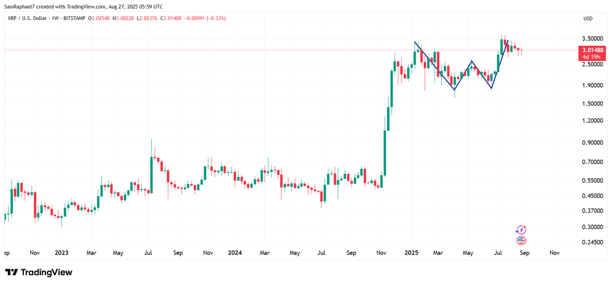 For context, this W pattern formed on the weekly chart after XRP dropped from the $3.4 peak in January. From this level, it hit a low of $2.11 in April, recovered to a high of $2.6 in May before collapsing again to around $2 in June. The latest recovery back above the January peak of $3.4 completed the formation of the W pattern.
