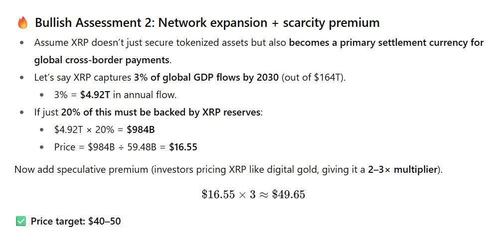 Meanwhile, ChatGPT also considered another case where XRP expands beyond tokenization and becomes a major settlement currency for cross-border payments. If XRP handles 3% of global GDP flows, roughly $4.92 trillion in 2030, and 20% of that flow requires XRP reserves, the total would come to $984 billion.