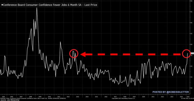 In February, the share of US consumers saying there will be fewer jobs over the next 6 months spiked to 26%, the highest in 12 years.