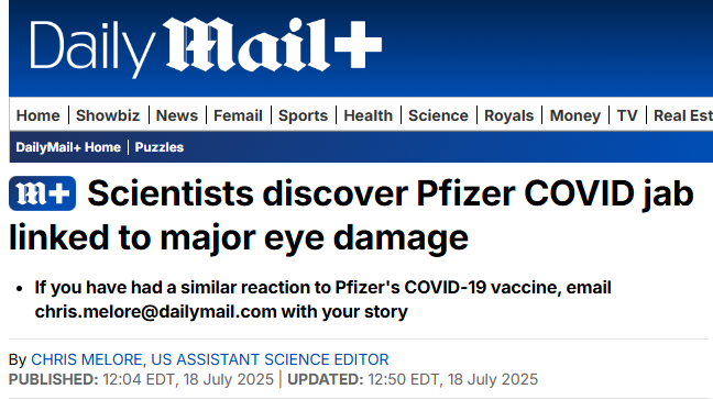 11. July 2025, Daily Mail revealed that Pfizer Covid Vaccine is linked to eye damage!