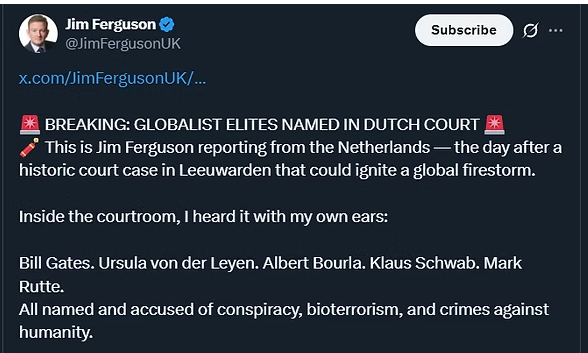 Ursula is mentioned in court documents reported by @JimFergusonUK who was in the courtroom in the Netherlands. She along with Bill Gates, Albert Bourla, Klaus Schwab and Mark Rutte are accused of Conspiracy, bioterrorism, and Crimes Against Humanity.