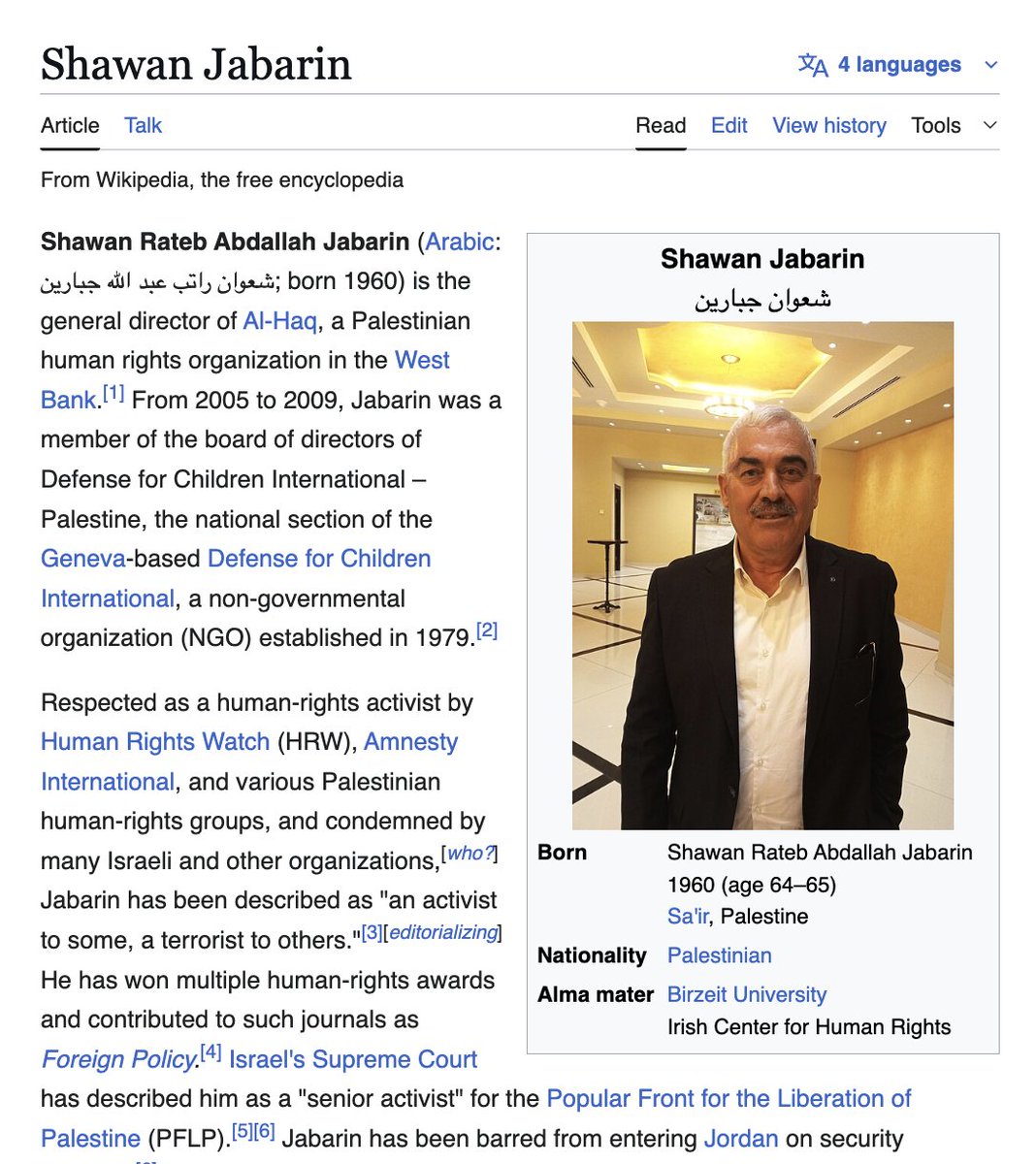 @IRIglobal Shawan Jabarin is the general director of Al-Haq and a former senior member of PFLP. Jabarin denies being a member of PFLP, but there are contemporary Arabic sources which label him as such.