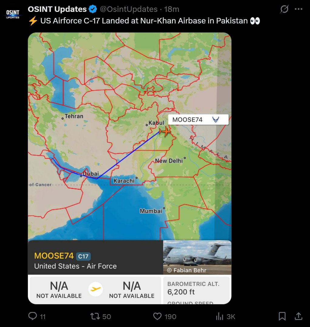 Meanwhile, repeated US Airforce C-17 Landed at Nur-Khan Airbase in Pakistan.