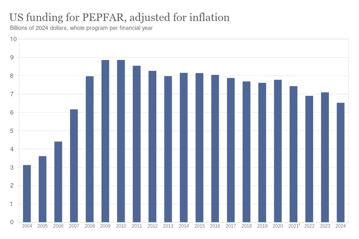 This is false. PEPFAR is not a program whose appropriations have grown over time, leading to extra and frivolous spending. PEPFAR spending in nominal terms has been the same since 2009, so in real terms it has decreased a lot.