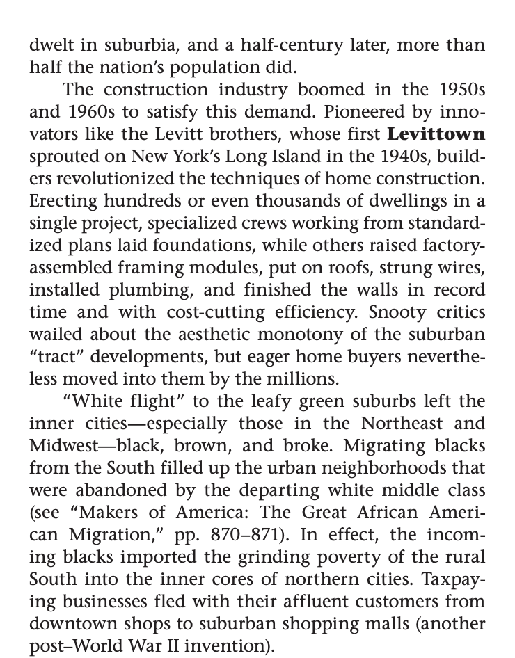 There's a common right wing talking point that the 'official story' we were 'all taught in school' was that white Americans moved to the suburbs because they were racist. Except that's...not what we were taught in school at all.