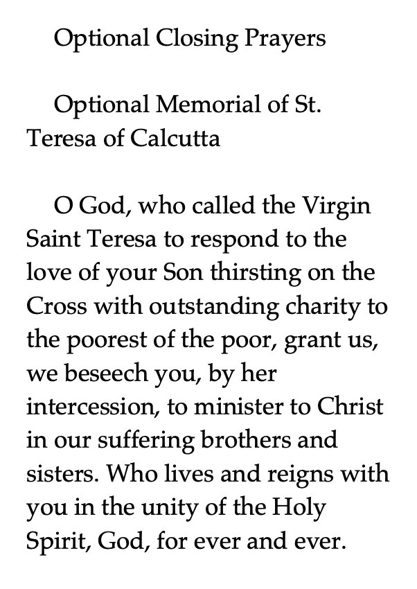 O God, who called the Virgin Saint Teresa to respond to the love of your Son thirsting on the Cross with outstanding charity to the poorest of the poor, grant us, we beseech you…