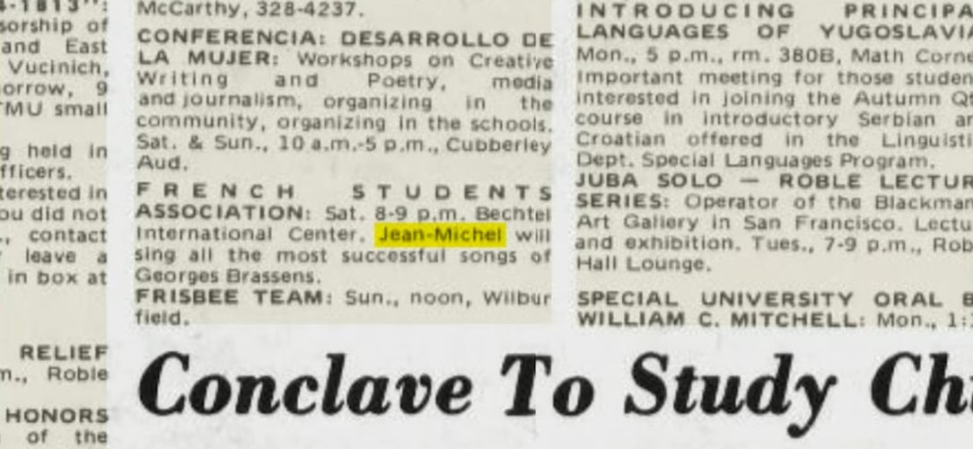 (6/8) Un ancien étudiant de Stanford lui glisse qu’elle devrait consulter les journaux archivés de l’université. Surprise: un certain Jean-Michel, étudiant français, a chanté du Georges Brassens à l’association des étudiants français de Stanford. Étrangement, ce Jean-Michel n’apparaît pas sur la liste des diplômés. Était-il de passage ?