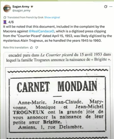 (3/7) Candace met en lumière Alain Trogneux, prof à Amiens, qui a numérisé les archives du Courrier Picard (1945-1960), incluant le faire-part de naissance de #Brigitte, souvent cité comme preuve. Une histoire révélée par Sagan Army.