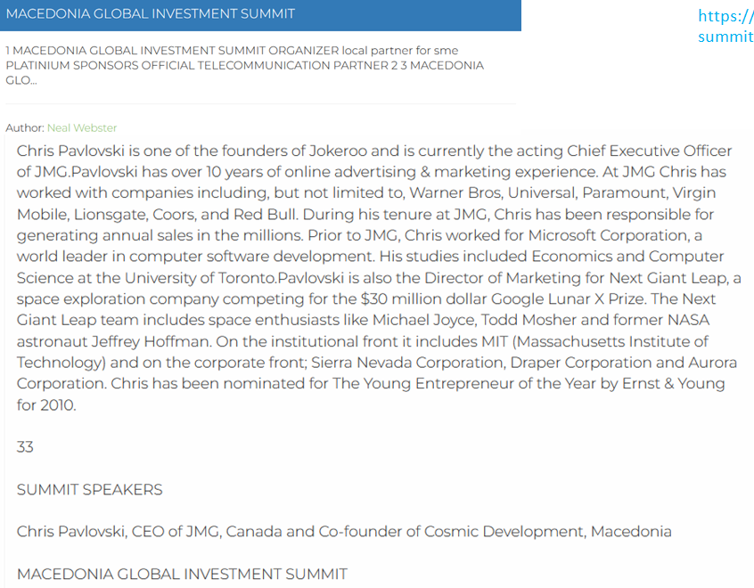 🧵8. In a bio for Chris Pavlovski posted on the Macedonia Summit 2012 website, it is revealed that the Rumble CEO previously worked for several 'corporate media' outfits including Warner Bros, Paramount, Universal and Lionsgate.