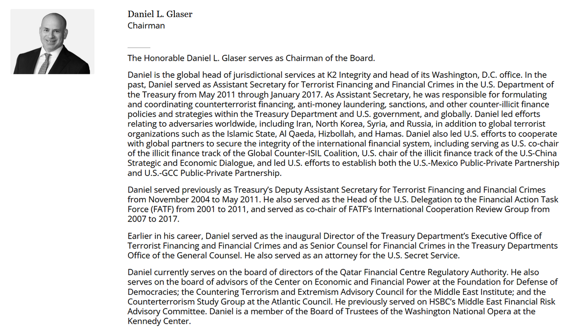 Before K2, Glaser was Assistant Secretary for Terrorist Financing at U.S. Treasury. Then he rotated into The Washington Institute (WINEP), an Israel-aligned policy machine shaping regional doctrine. His WINEP author page remains live. Glaser converted his official power into a private one.