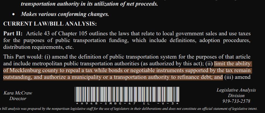 If the local government in Charlotte gets their way, with this 1% sales tax increase and 5% vehicle tax increase, they have baked it into the legislation that they cannot repeal it if they have outstanding revenue bond debt, which is their financing scheme for their $25B payout.