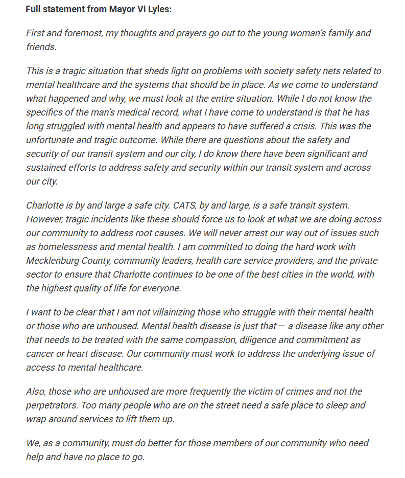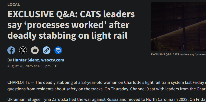 Charlotte's light rail is plagued with a history of stabbings, beatings, etc. And city council members were quick to convene the Monday following the murder to express concern that citizens would no longer vote for their 1% tax increase this fall for public transit.