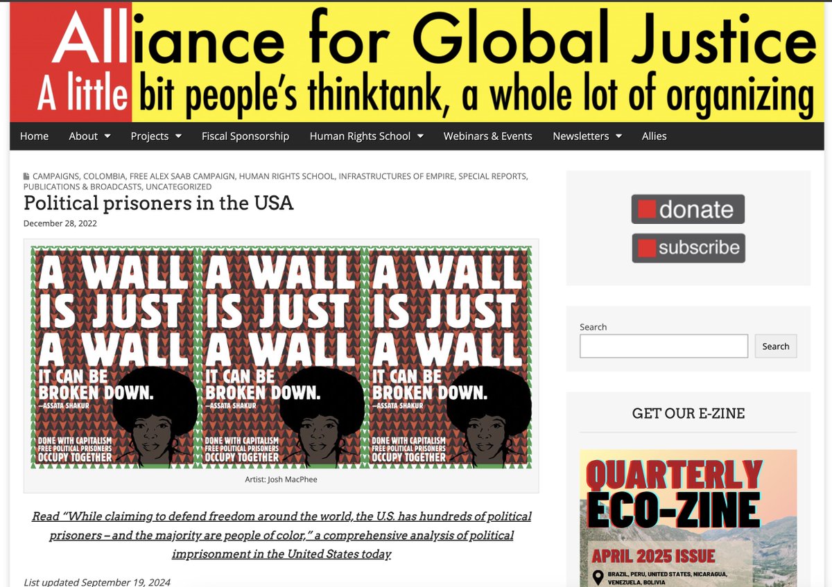 The nonprofit accepting contributions on behalf of Refuse Fascism, Alliance for Global Justice, has a list of "political prisoners" on their website which they support. Murderers and terrorists are among them.