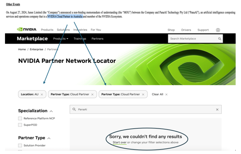 4/9: $SUPX had also claimed that PanaAI had NVIDIA partner status; the NVIDIA partner search also came up empty for “PanaAI”.