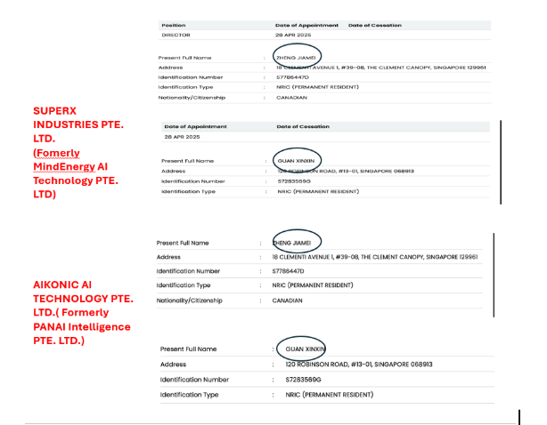 5/9: We believe $SUPX’s acquisition of Mindenergy AI (Now SUPERX Industries) in 2025 was another undisclosed related party transaction. Singaporean entity filings revealed that Mindenergy shared directors, Zheng Jiamei and Guan Xinxin, with PanaAI, the same “partner” that had already received $3m for the “AI superfactory”. We believe this deal was just another way for insiders to funnel money out of the company.