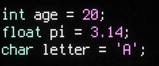 We have some key types: int, float, double, char. int is for integers; float and double for rational numbers; char for characters. Really straight forward.