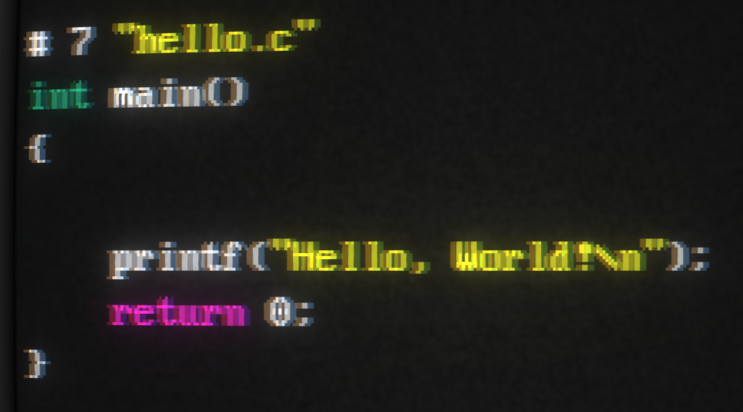 The resulting "hello.i" file is huge, but at the very end, you'll find our code, minus the comments: