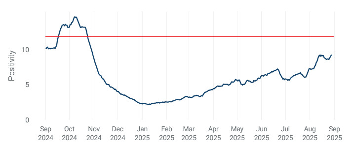 UKHSA says positivity is 9.25%, but when I calculate the average from the raw data, it's 9.62%.