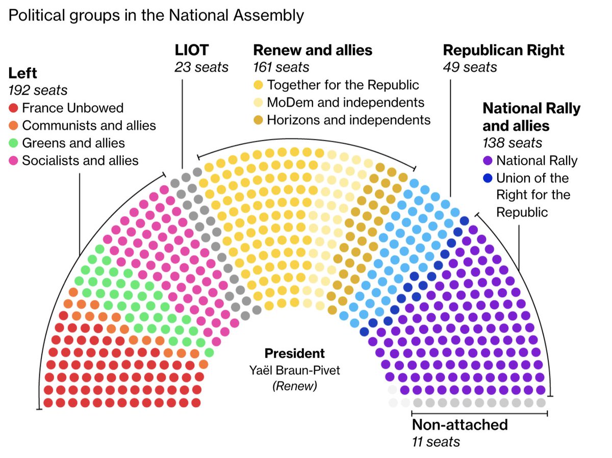 In France, if 280 or more lawmakers vote “no confidence,” the government falls.