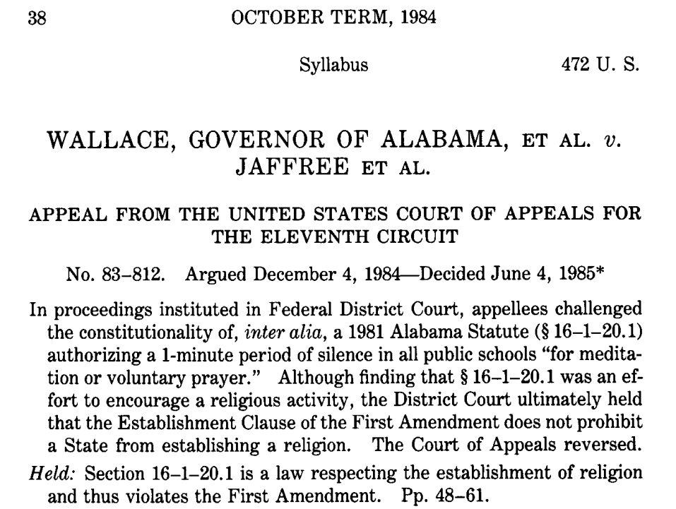 6) In a 1985 SCOTUS case—also in error—this ruling was extended further to prohibit schools from providing one minute at the start of each day for a moment of "meditation or voluntary prayer."