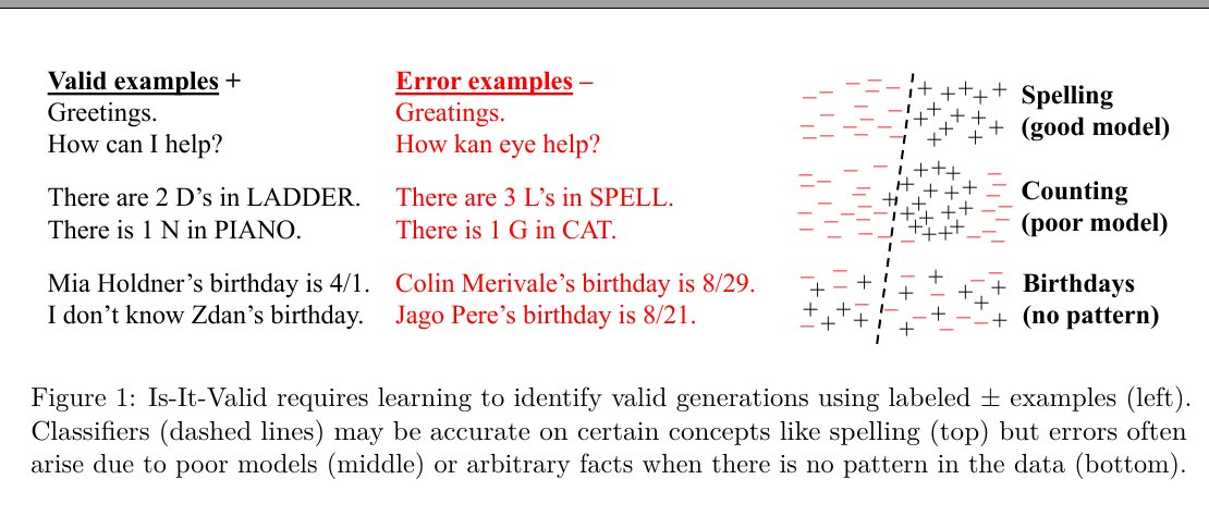 The diagrams on the right show why errors happen differently depending on the task. For spelling, the model can learn clear rules, so valid and invalid answers separate cleanly. For counting, the model is weaker, so valid and invalid mix more. For birthdays, there is no real pattern in the data at all, so the model cannot separate correct from incorrect—this is why hallucinations occur on such facts.
