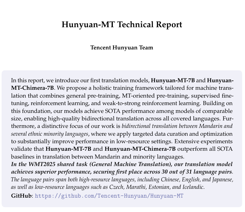 Hunyuan-MT-7B came first in 30 out of the 31 tests in a general machine-translation competition held as part of the coming WMT25 conference