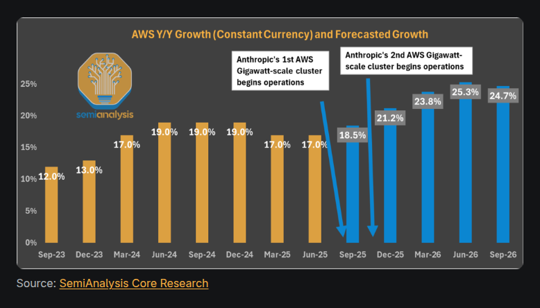 SemiAnalysis expects these clusters to lift AWS growth above 20% YoY as they enter service.