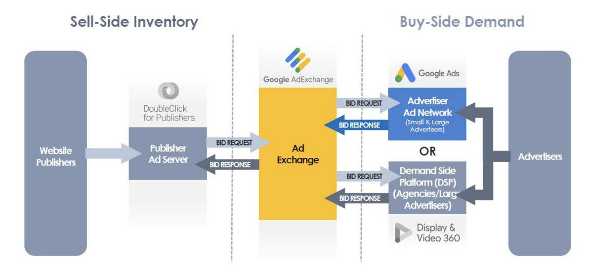 Publishers (websites) sell ad space, advertisers buy it, and exchanges run the auctions.