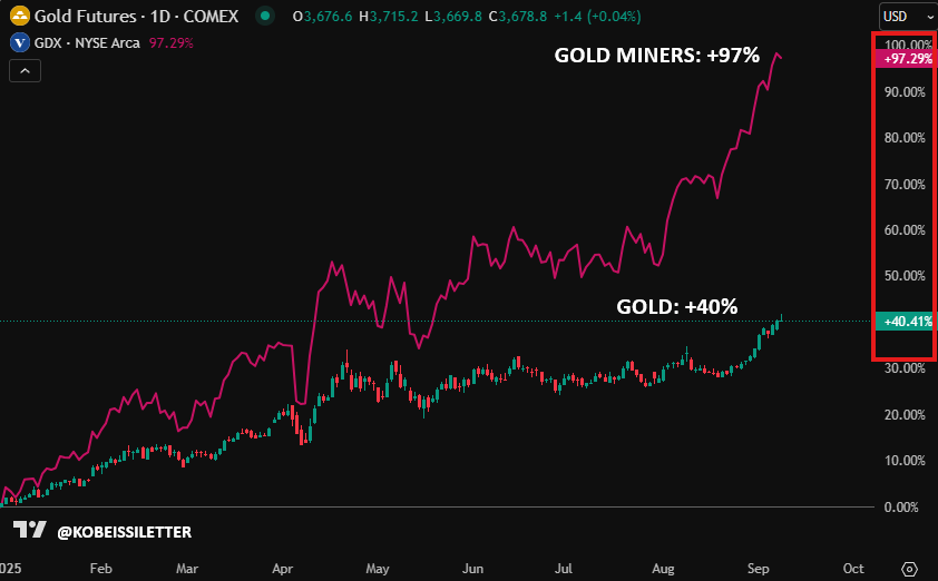 Gold miners are now up nearly 100% YTD, or ~10 TIMES the S&P 500's return.