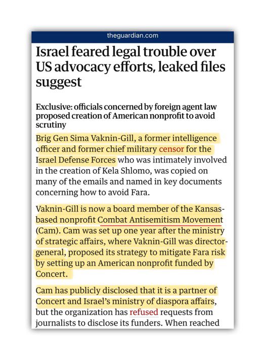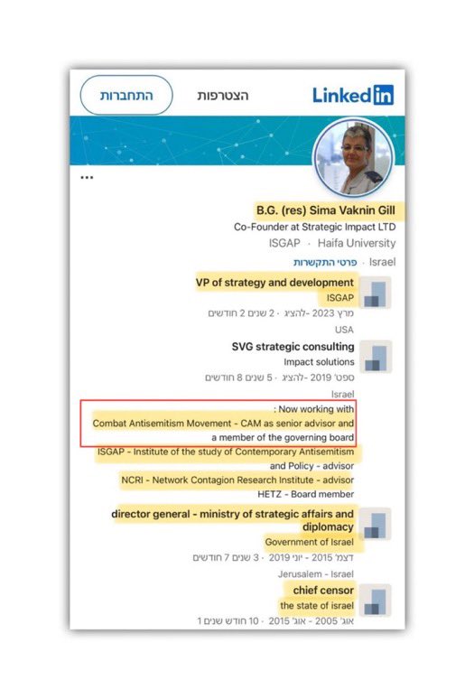 Combat Antisemitism Movement (CAM) is an ISRAEL managed/funded NGO. It was created by Israel’s Ministry of Strategic Affairs & managed by Israel’s former Chief Censor, Sima Vaknin Gill