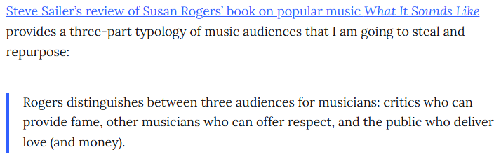 Thanks to @Steve_Sailer, I see the function of a literary critic as analogous to how Rogers describes music critics.