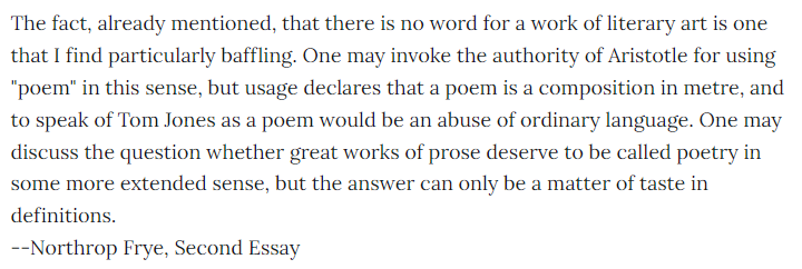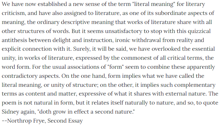 Frye is making a synthesis out of the prior two phases, the literal and descriptive phases. This section will also be very Aristotelian, because Frye will focus on the various senses of the term "form".