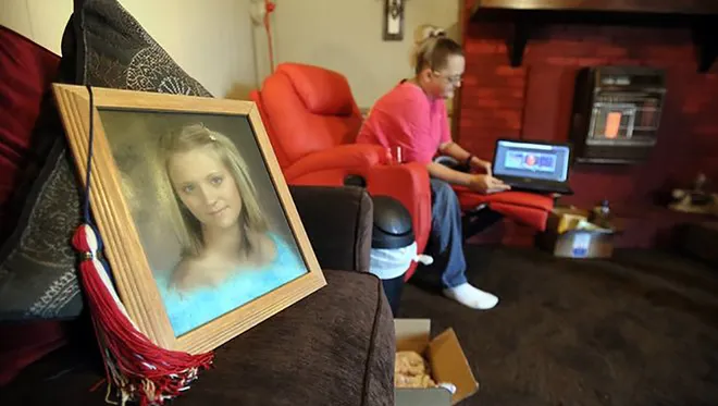 (Photo: This 2015 photo shows Jessica Chambers’ senior portrait and graduating tassel resting on the living room couch of her mother Lisa Chambers’ Courtland, Miss. home.)