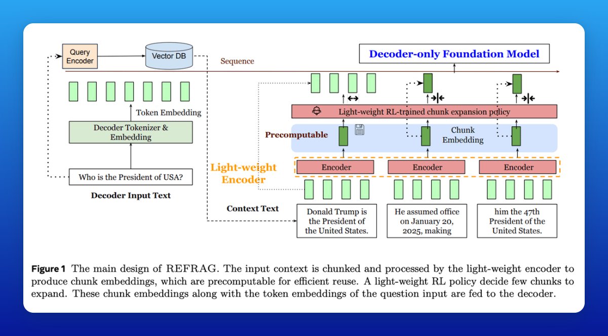 REFRAG replaces most retrieved tokens with precomputed chunk embeddings at decode time, then selectively expands only the few chunks that matter.