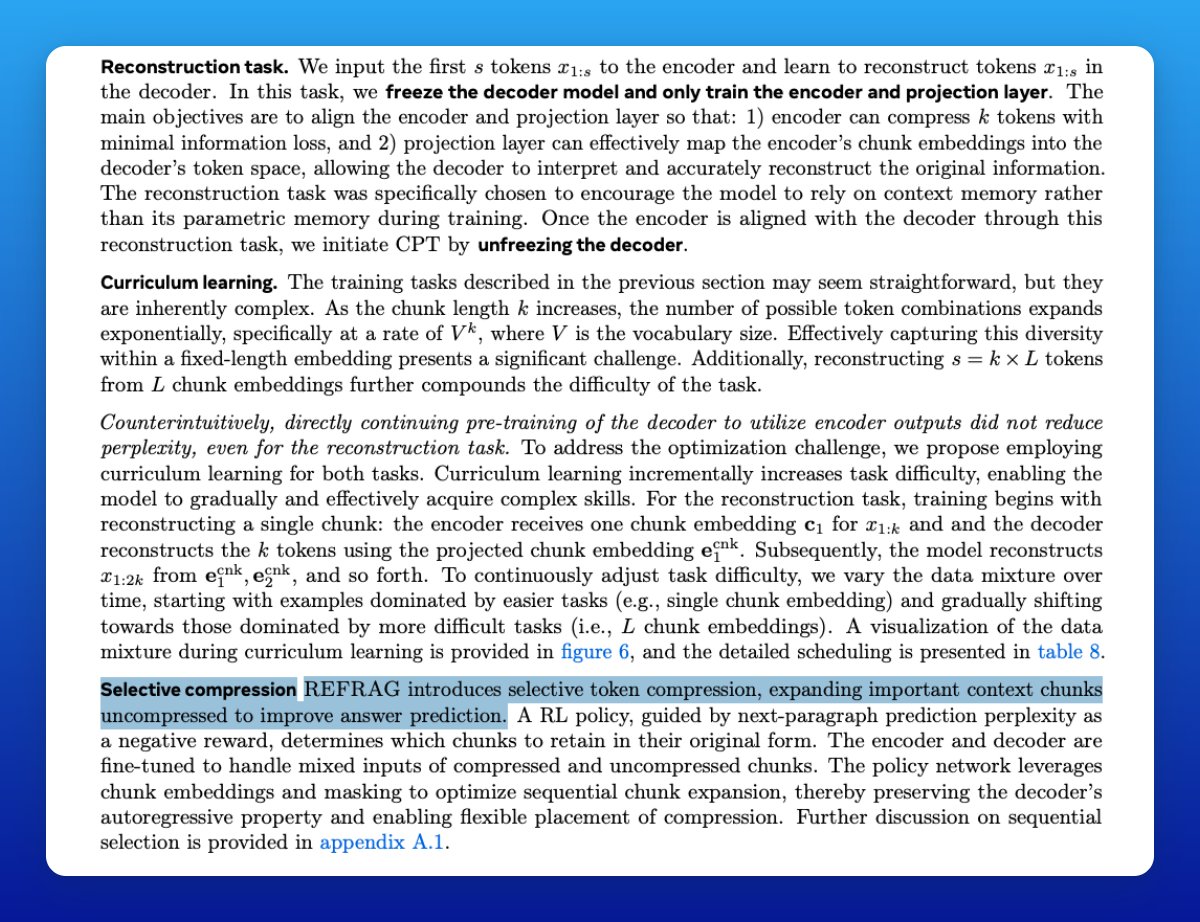 So REFRAG avoids wasting attention across irrelevant text, only paying full price for chunks that matter.