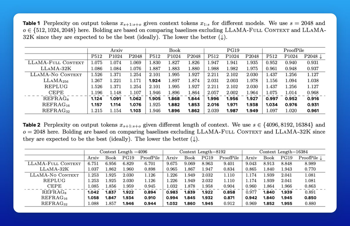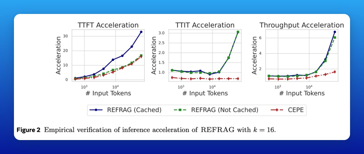 By compressing most chunks, REFRAG effectively extends model context length up to 16× more tokens, letting it juggle way more retrieved passages without breaking latency budgets.