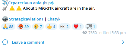 3/x Based on reports from Ukrainian monitoring channels, 5 MiG-31K's were active at the beginning of the attacks. These monitoring channels tune into the radio frequencies of the Russian pilots and track their movements and activities from that.