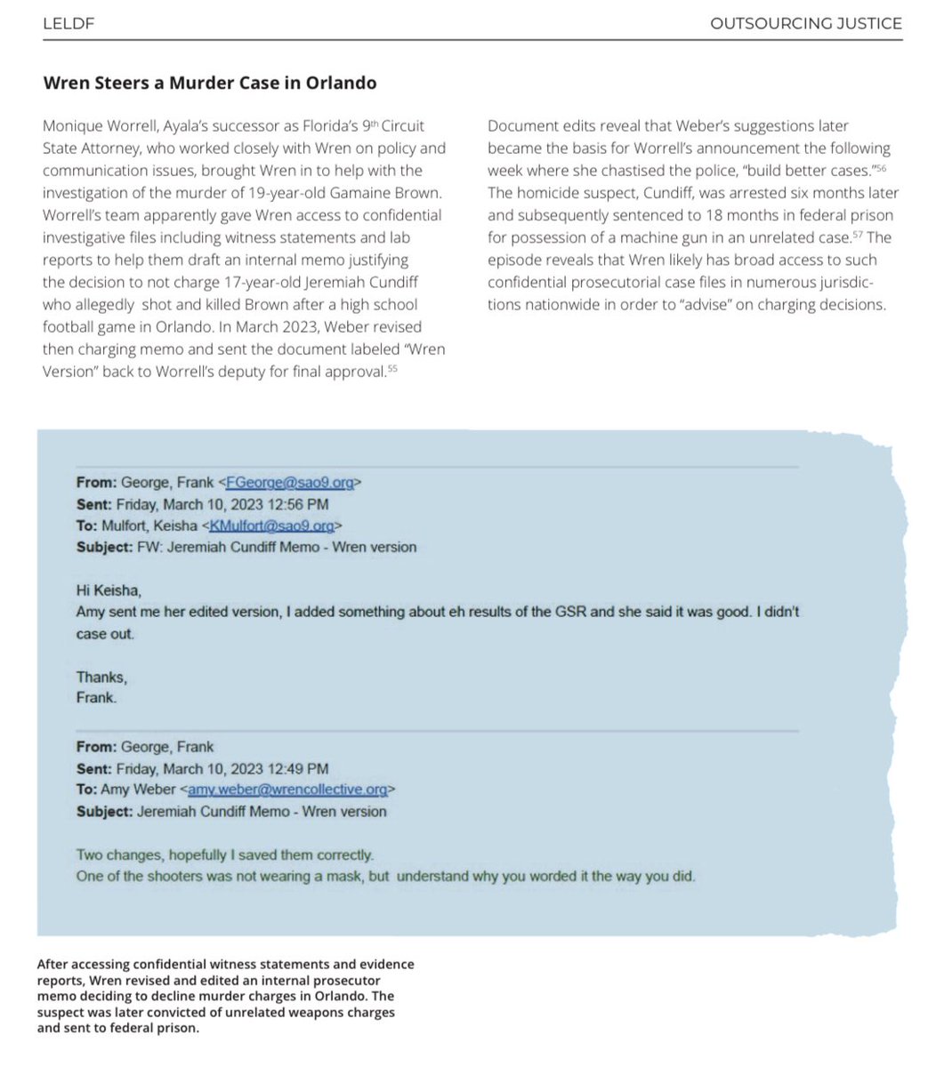 This is really insane: emails show the (now removed) DA of Orlando sending forensics files to Wren, allowing them to edit her memo explaining why she wouldn’t charge a 17 year old who shot and killed someone at a football game.