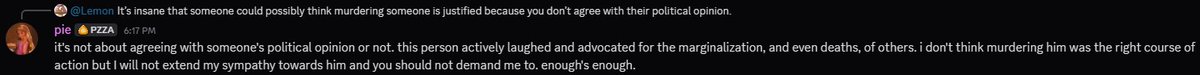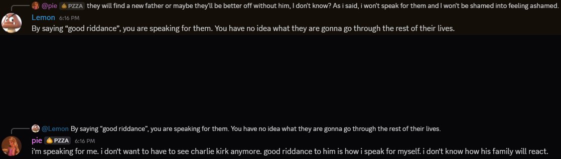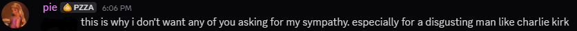 my statement (or whatever we call it these days) regarding the whole Charlie Kirk @charliekirk11 situation. no way does he deserve an official statement so he'll get it via Discord. plus i'm only doing this so people don't demand me to eulogize him: #CharlieKirk #CharlieKirkshot