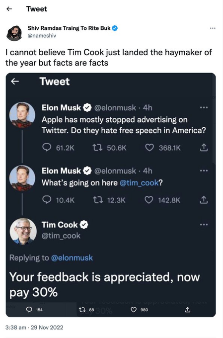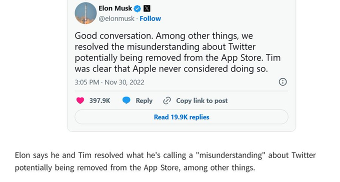 Musk claims Apple threatened to pull Twitter from the App Store.