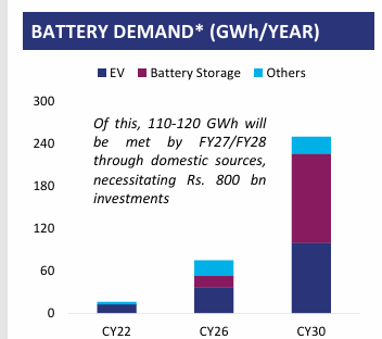 🔹Domestic Manufacturing: 110–120 GWh to be met by FY27/28, requiring ₹800 bn investments in gigafactories and supply chains.