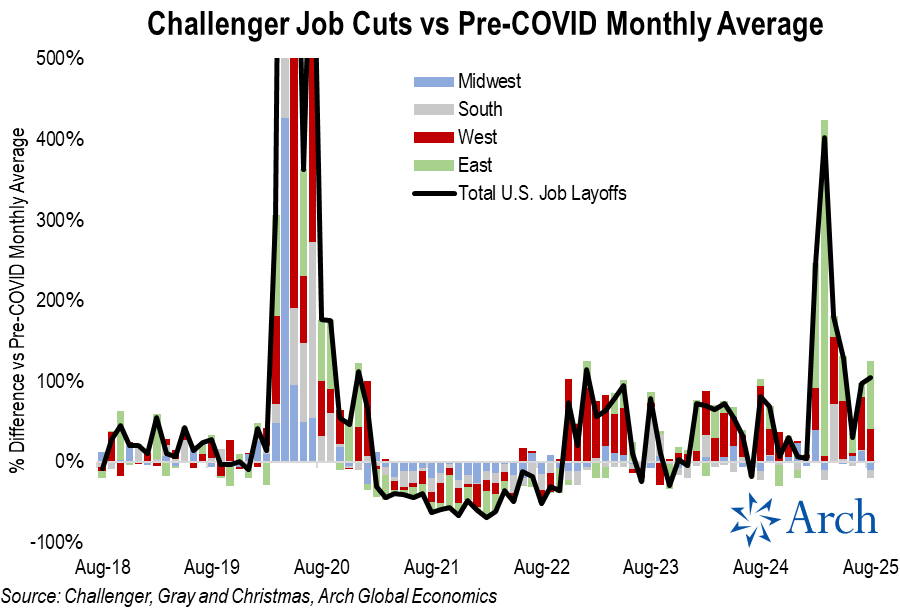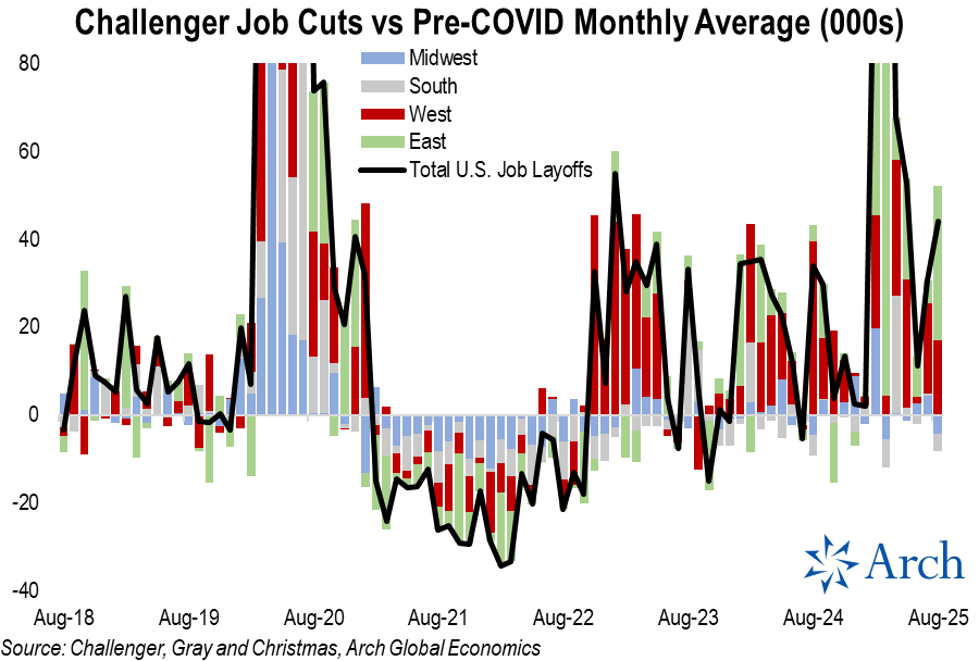 On an absolute basis, announced job cuts were ~44k above normal for August, with most of the lift coming from the east (35.2k above normal), followed by the West (17.1k), with the South and Midwest both below their pre-COVID norm, -3.9k and -4.3k, respectively.
