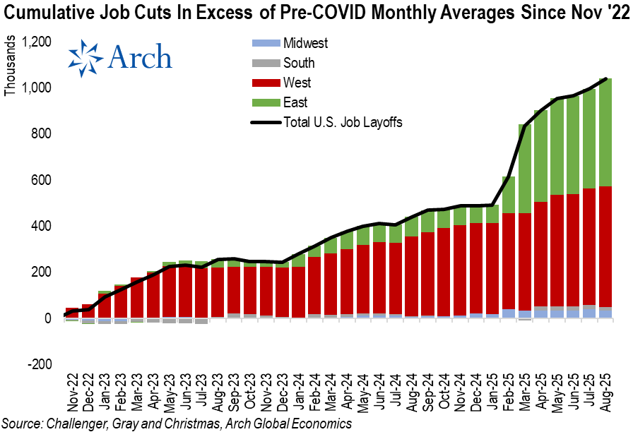 The West still accounts for the bulk of the excess layoffs (522k), but the East (468k) has nearly caught up due to the DOGE layoffs announced earlier this year.