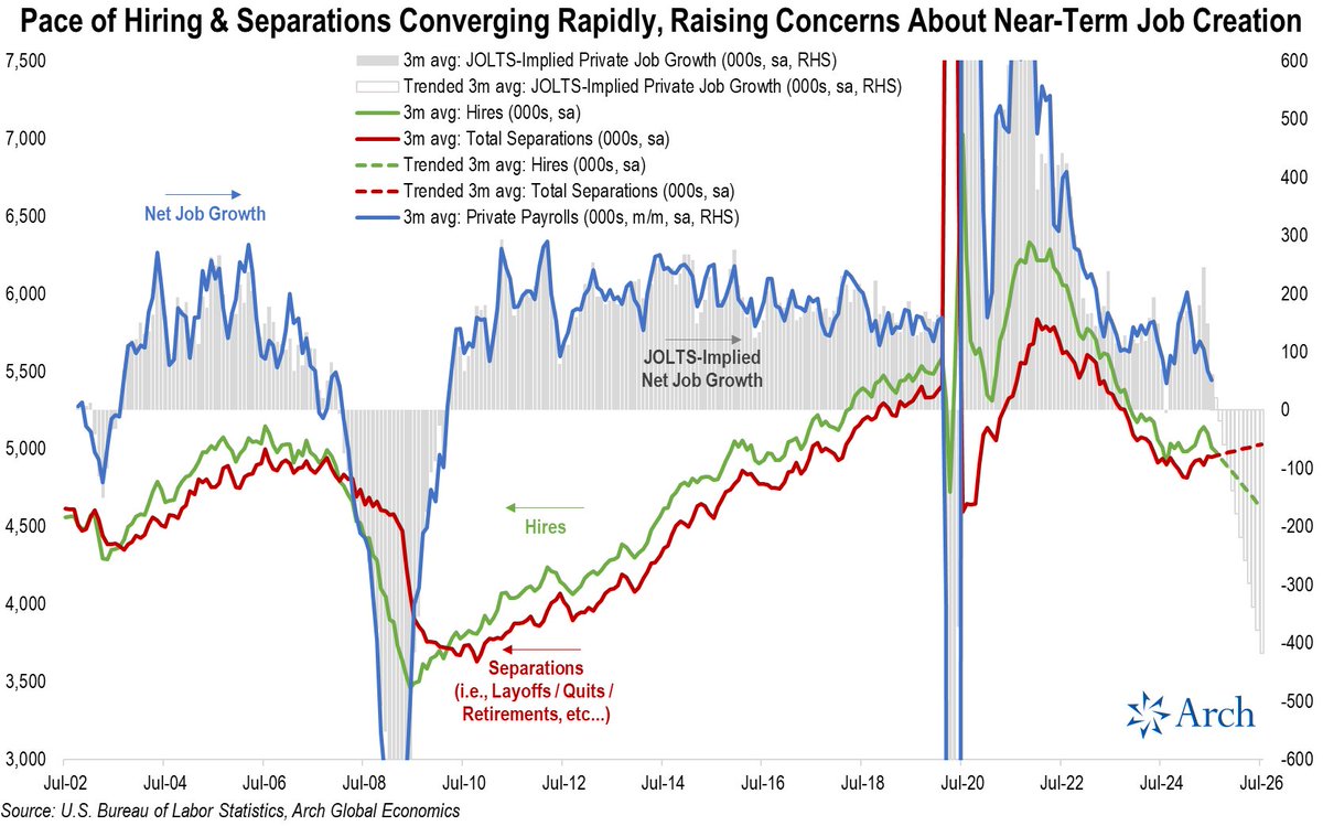 It's pretty straightforward: hiring has downshifted and separations have turned higher in recent months.