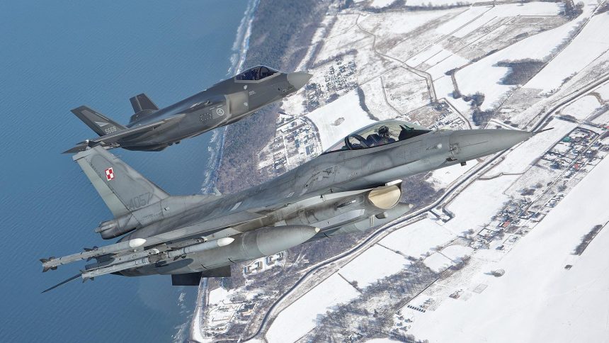 (File photo of a Polish F-16 and a Norwegian F-35. Polish F-16s and Dutch F-35s were involved in the defense against the Russian drones. (Image credit: Bartek Bera via NATO Allied Air Command)