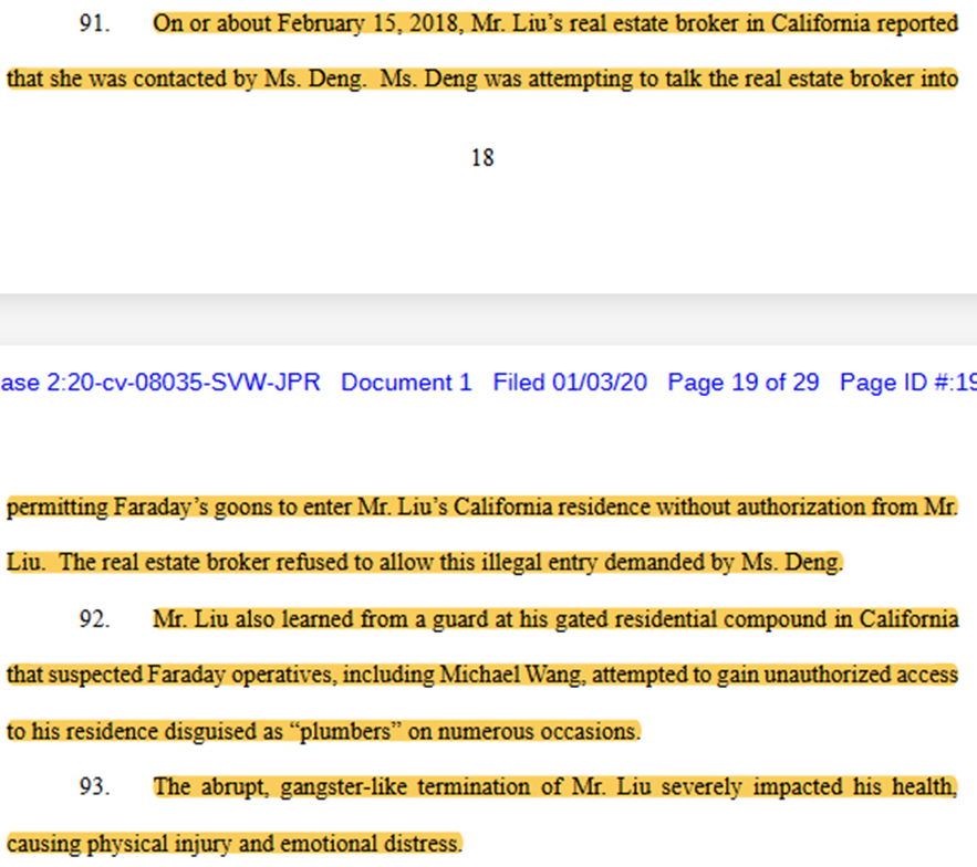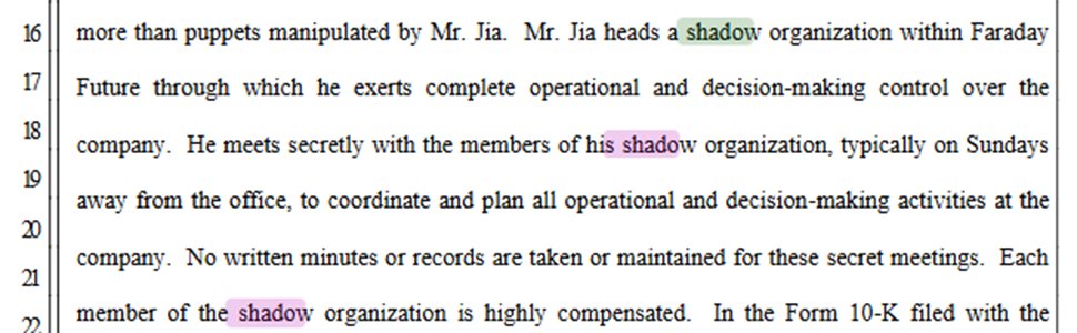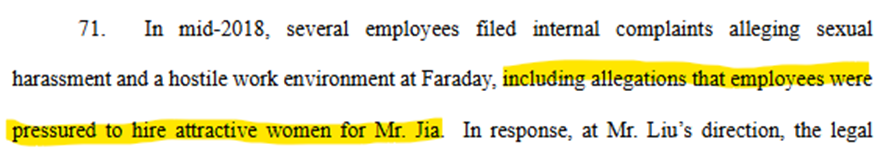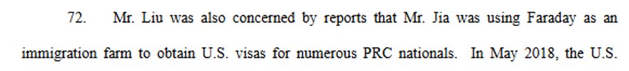 10/ A lawsuit filed by $FFAI's former General Counsel (GC) alleged YT induced him to work there by falsely claiming they closed $2 billion in investments from Evergrande. The GC investigated numerous claims that YT was using the company as “an immigration farm” fostering a hostile work environment where “employees were pressured to hire attractive women for Mr. Jia.” When the GC recommended YT step back as the decision maker in 2018, “Mr. Jia became enraged, openly cursed [the GC] and threatened him.” YT’s associates then tried to access the GC’s house dressed as “plumbers” on numerous occasions.