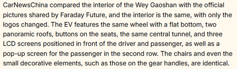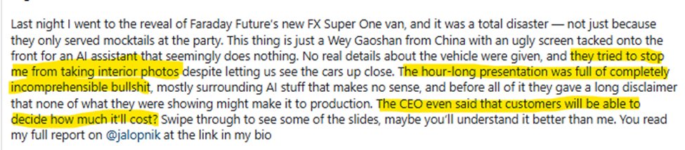 7/ One day after disclosing its Wells Notice, $FFAI unveiled its FX Super One—which appears to just be a Chinese-made EV minivan from Great Wall Motors with the $FFAI logo swapped out. Reportedly, even the small decorative elements are the same. One reporter at the unveiling called the presentation “incomprehensible bullshit.”
