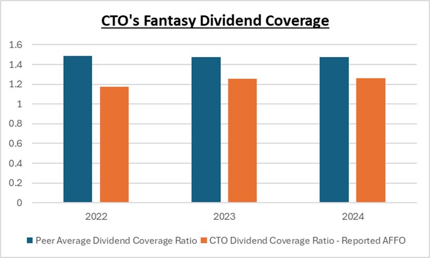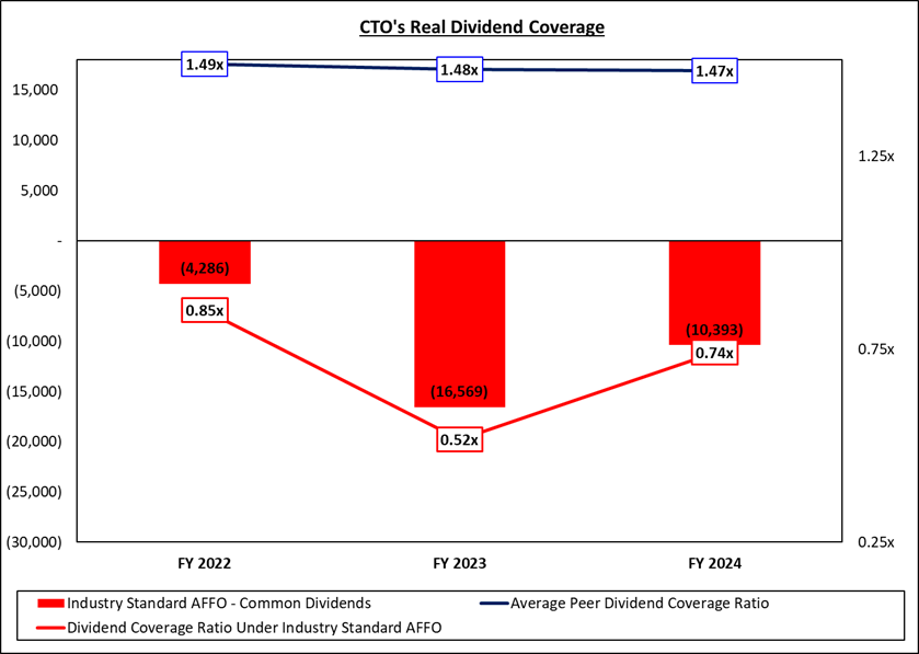 $CTO's cash from operations over the TTM has been ~$17m a quarter, but total dividend obligations are >$14m and recurring capex was ~$5.7m per quarter 2023-2024. Cash is just $8.4m. We don’t think that math works, and investors can soon expect something dilutive—dilution , debt, an inopportune property sale to make ends meet