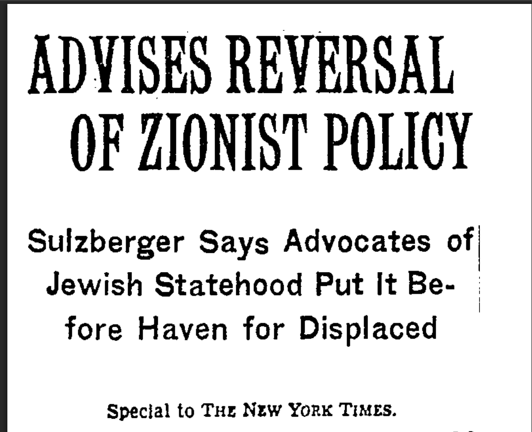In 1946, Arthur Sulzberger, publisher of the New York Times, attacked the Zionists for abandoning the holocaust survivors: